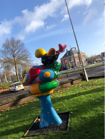 Franz Bodner is de kunstenaar van dit prachtige beeld. Het standbeeld de Liefdesboom van polyester, vind ik mooi door de felle kleuren en het mooie vogeltje. De locatie van dit kunstwerk maakt het helpt ook erg met hoe mooi ik het vind. Het standbeeld geeft me een erg liefdevol en zachte gevoel als ik ernaar kijk. De titel van dit kunstwerk verwijst naar de huwelijken die op deze historische locatie worden beknopt vandaar staat hij dus in de tuin van het Oude Raadhuis. Voor de kunstenaar is uitmonden in het moederschap het mooiste geluk. Je zal vast denken waar heb je het nou opeens over? Ik was ook erg verbaast toen ik erachter kwam dat het beeld een moeder met een kind in haar armen moet voorstellen.
